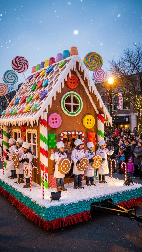Turn your trailer into a life-size gingerbread house surrounded by candy props. This is colorful and playful, great for bakeries, youth groups, or family floats.