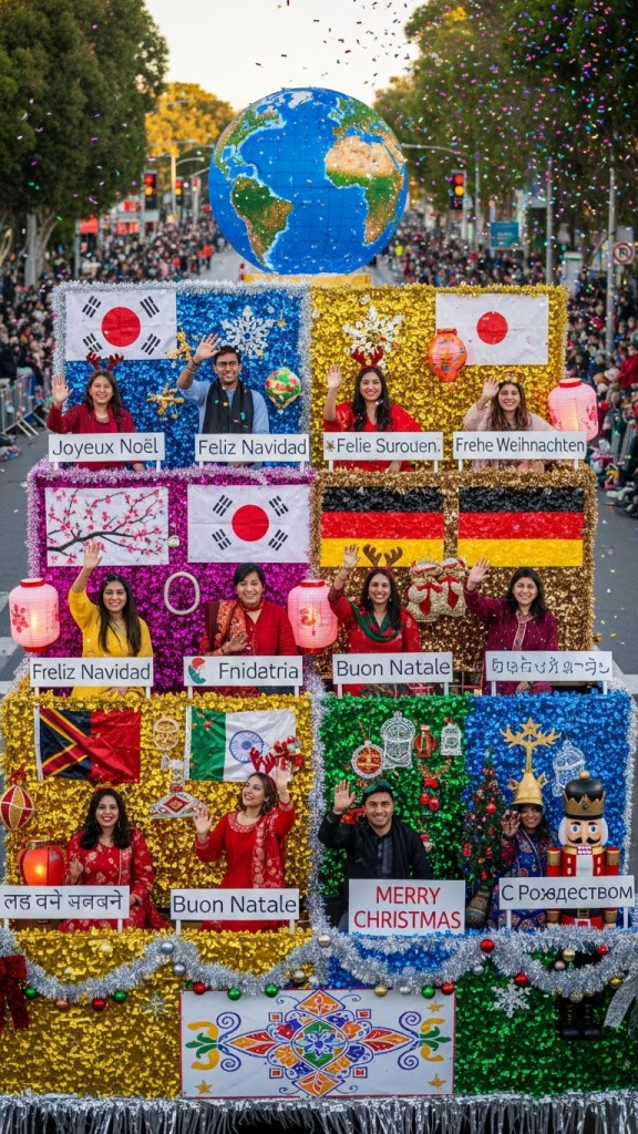 Things you need: banners, printed or painted flags, world map/globe prop, fabrics in flag colors, simple cultural costume pieces, multilingual “Merry Christmas” signs.