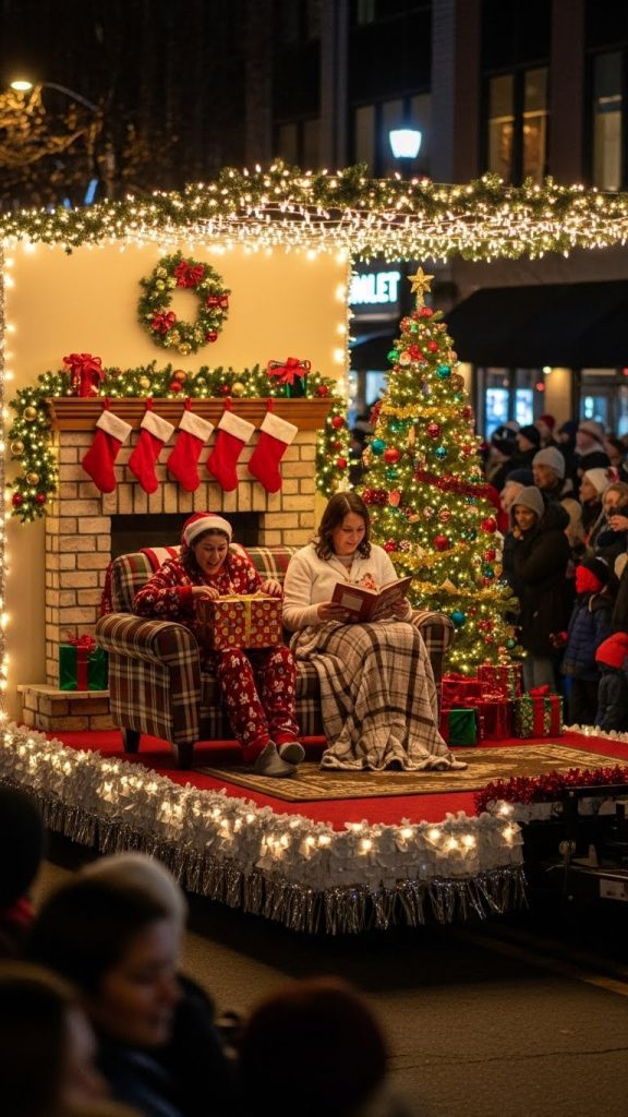 Re-create a living room on wheels: a couch, fake fireplace, stockings, and a Christmas tree. It feels warm, relatable, and easy to build mostly from props you already own.