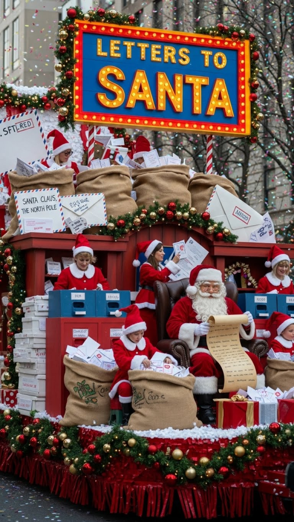 This float focuses on the magic of letters traveling to Santa. Think post office meets North Pole: mailbags, oversized envelopes, and a sorting station.