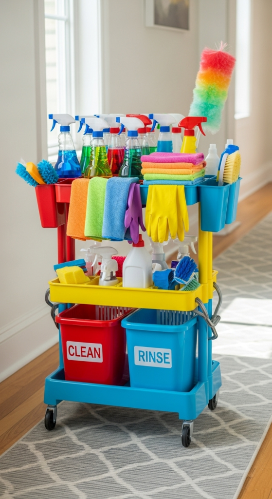 - Assign each shelf to different supplies: sprays, cloths, brushes, large tools.