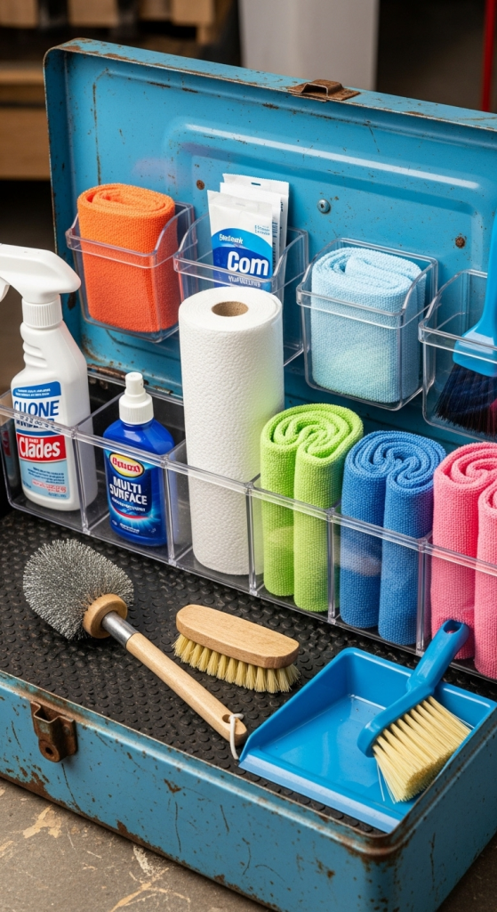 Turn an old toolbox into a portable cleaning kit—great for outdoor or garage spaces.