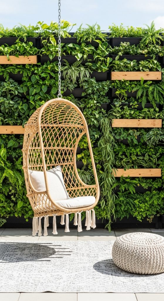 - Install a strong single-seat swing or hanging chair from an overhead beam, pergola, or ceiling hook placed close to a wall or fence.