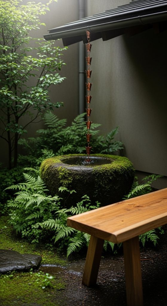 Design a tiny contemplative seating spot near a rain chain or gentle water feature.