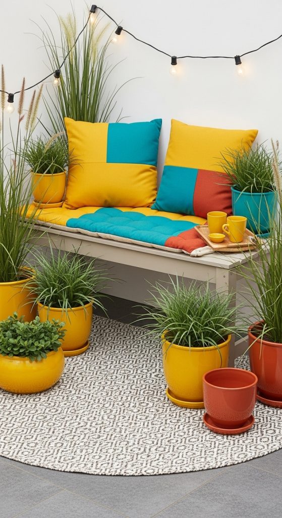Use bold color in cushions and pots to define a cheerful micro‑patio in one corner.