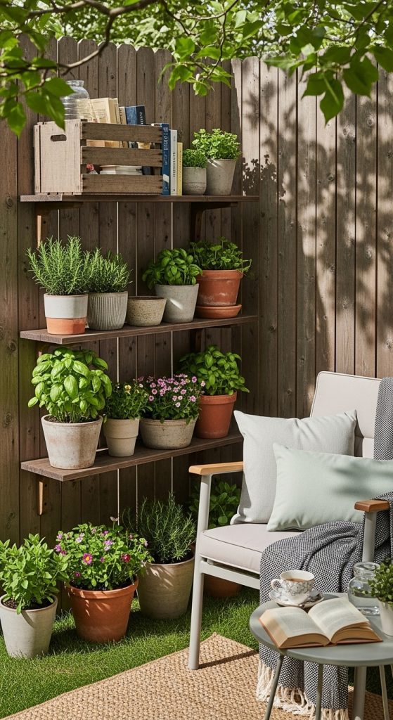 - Use a narrow, weather-resistant shelving unit or wall‑mounted shelves against a fence or wall.