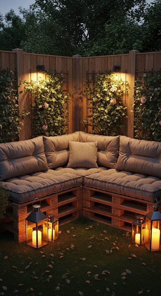 Turn a neglected fence corner into a cozy “pocket” sofa zone using pallets and climbers.