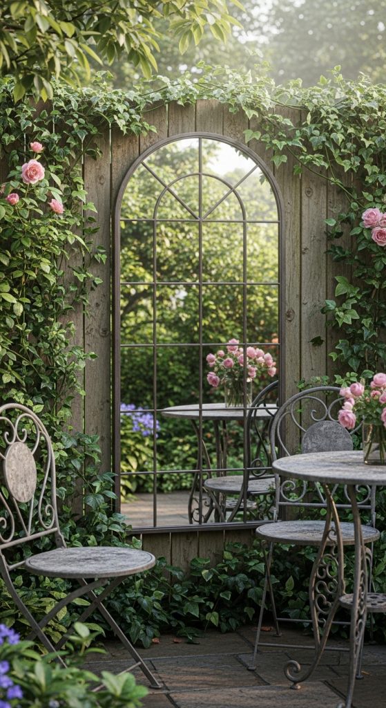 - Mount a weather-resistant mirror on the fence or wall behind your seating. Choose a window‑shaped or arched frame for a “secret passage” illusion.