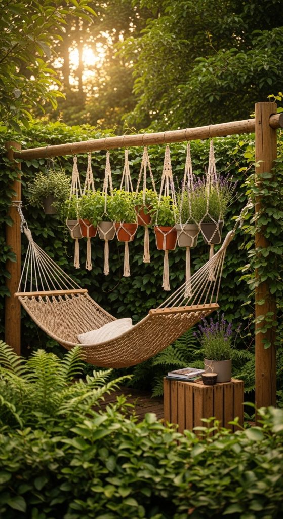 - Above one side of the hammock, fix a simple wooden or metal bar or wire, and hang small herb pots (mint, rosemary, lavender, thyme) in lightweight macramé or metal holders.