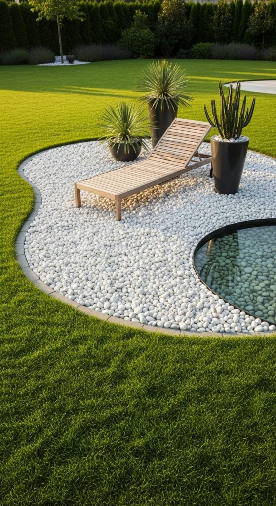 The contrast between lawn and pebble “island” makes this seating area feel intentional and sculptural.