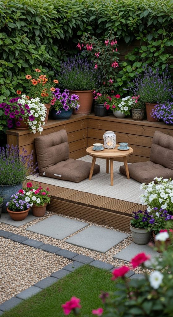 Mark out a small “zone” (even 1.5 m × 1.5 m works). Lay pavers, gravel, deck tiles, or an outdoor rug to visually separate it from the rest of the garden. - Add seating