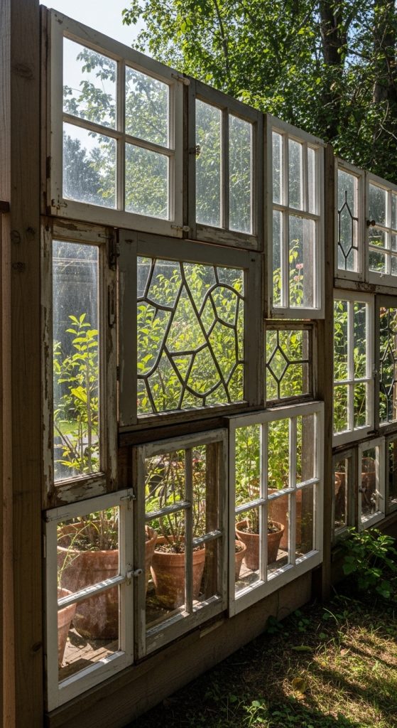 Create a fence made from old windows that doubles as a mini greenhouse wall for tender plants.