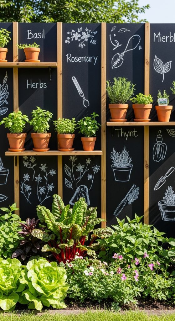 - Use chalk to label each herb, write garden notes, weekly menus, or seasonal messages across the upper half of the fence.