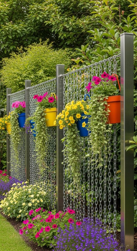 A light, airy fence made from vertical chains holding colorful planters instead of solid boards.
