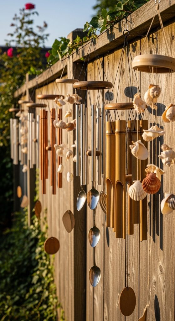 A fence that sings softly when the wind blows, using recycled metal and wood chimes.