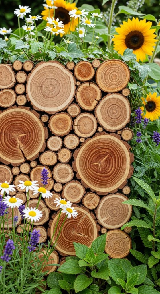 - Lay out your log slices on the ground to plan a patchwork pattern, mixing sizes for a natural, organic look.