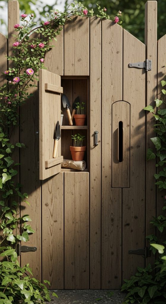 A practical fence with built-in “secret” compartments and a hidden mini door for tools or treasures.